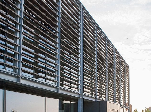 Bygningen fremstår af moderne karakter, domineret af et stort, højt glasparti i midten. Det centrale samlingsrum virker ud fra sin form som en ”luft skorsten” for naturlig ventilation i huset.